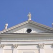 Prospetto facciata principale: elementi lapidei del timpano, sculture sommitali e inferiori, balaustra,